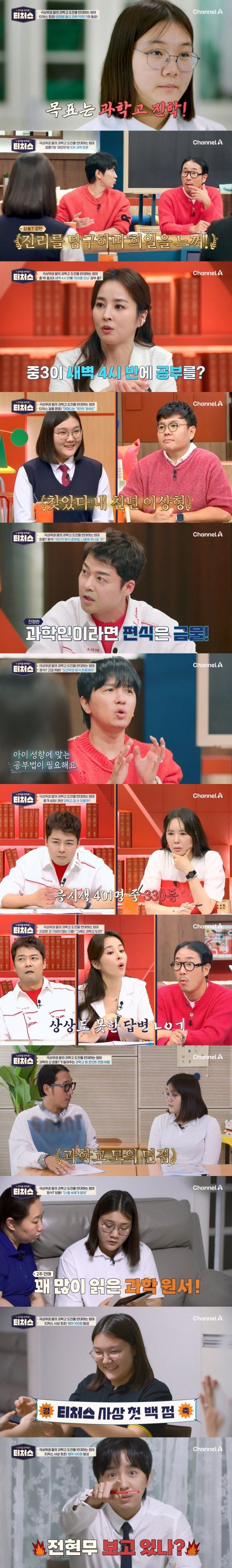 채널A '성적을 부탁해: 티처스'에서 대한민국 최고의 강사들이 학생과 가족에게 맞춤 솔루션을 제공하는 가운데, 중3 도전학생이 ‘영어 1타’ 조정식의 도움으로 영어 100점을 달성해 화제다. 21일 방송된 ‘티처스’에는 과학고 진학을 꿈꾸는 ‘과학 소녀’가 등장해, 조정식과 장풍의 특별 솔루션을 받았다.