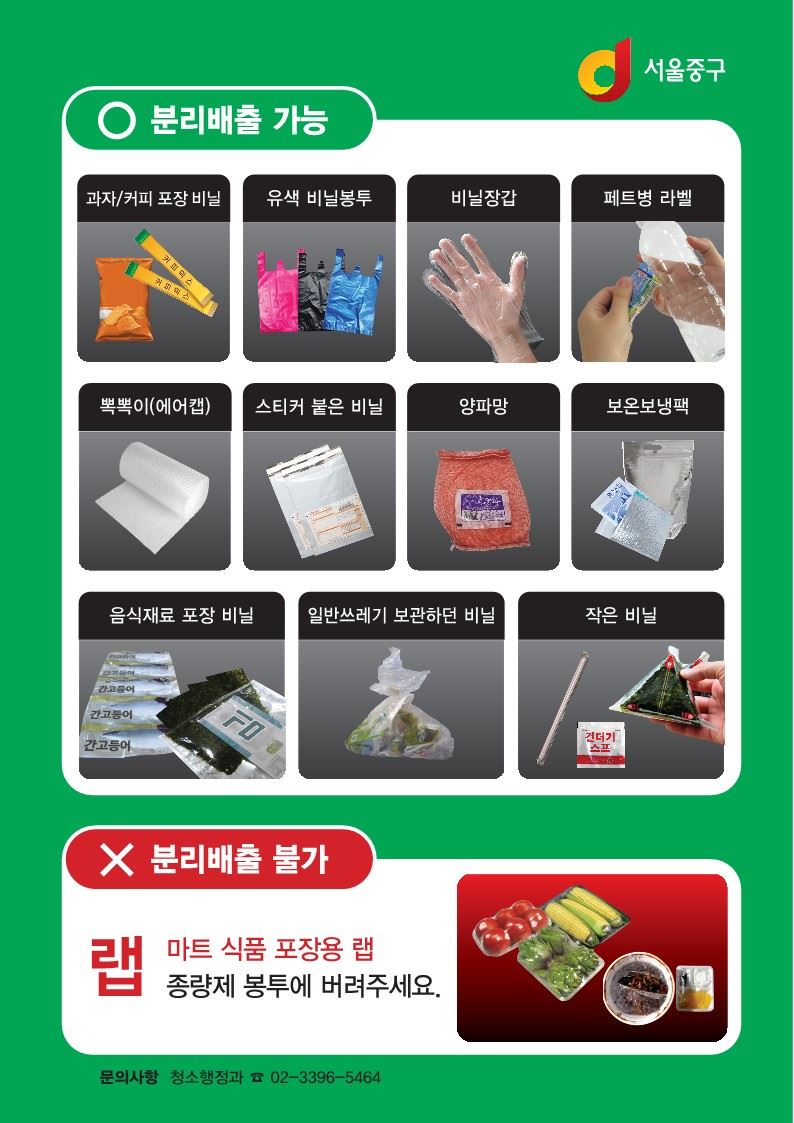 서울 중구(구청장 김길성)는 생활폐기물 감축과 자원화를 목표로 종량제 봉투에 버려지는 폐비닐의 분리배출을 강화한다고 발표했다.