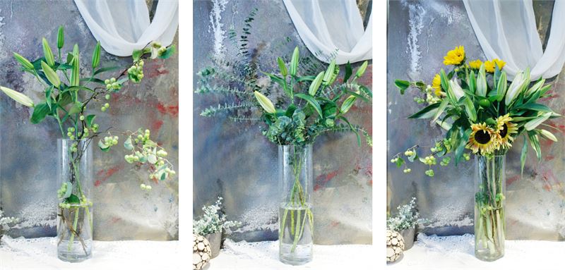 나리를 활용한 꽃꽂이 아이디어 (좌로부터 망개+나리, 유칼립투스+나리, 나리+해바라기 +망개)