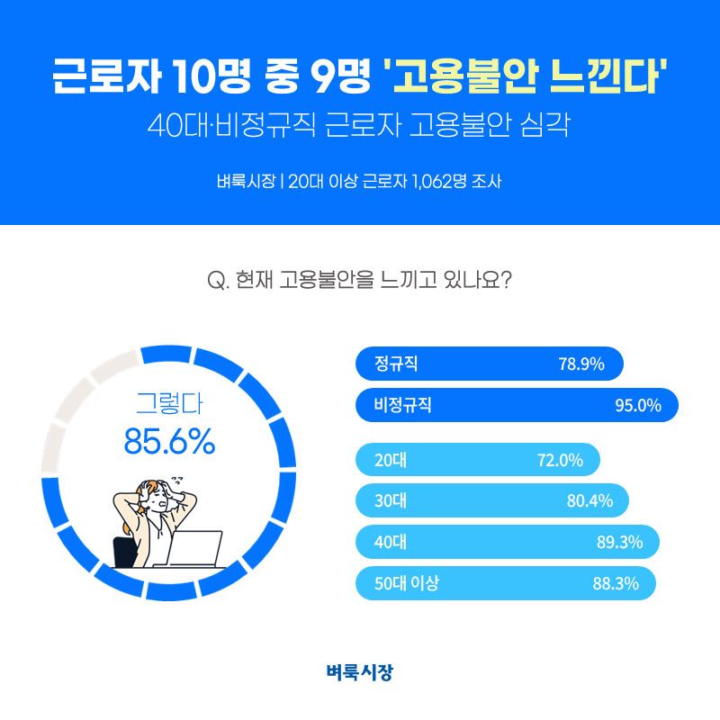 국민 대표 일자리 앱 '벼룩시장'이 직장인 1062명을 대상으로 실시한 ‘고용불안’ 설문조사 결과, 직장인의 85.6%가 현재 자신의 고용 상태에 불안감을 느끼고 있었으며, 고용불안을 전혀 느끼지 못한다는 응답은 2.8%에 불과했다.