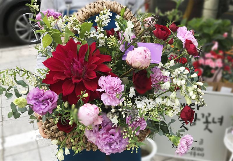 다알리아의 꽃말의 우아함이라고 하는데 꽃바구니 꽂은 다알리아 하나도 우아함이 돋보입니다.