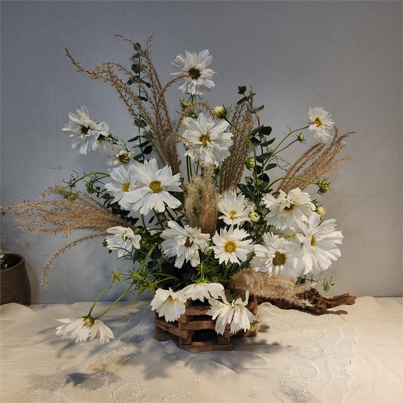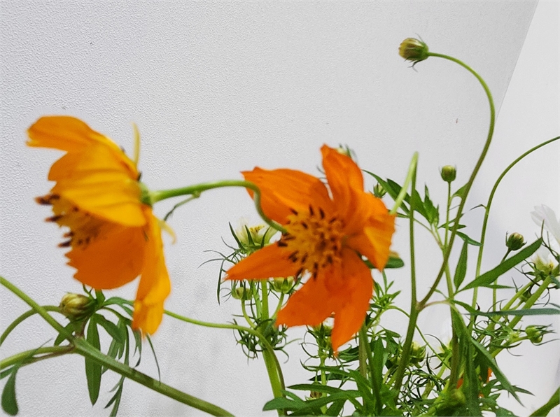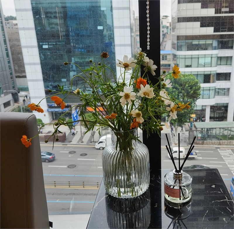 코스모스는 줄기가 가늘기 때문에 낮은 화병보다는 15cm되는 꽃병에 꽂아 줄기가 안정적으로 지탱할 수 있게 관상하는게 좋을 것 같습니다.