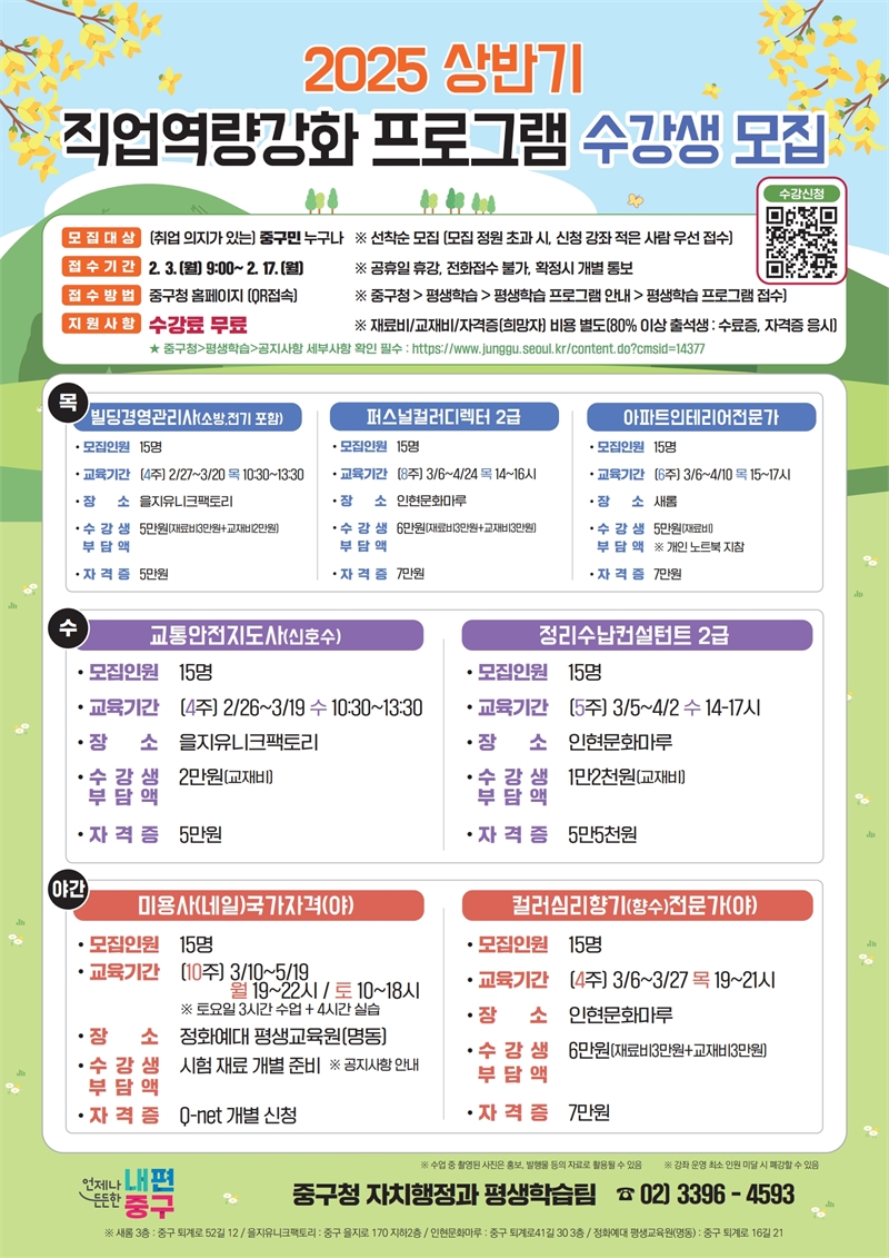 서울 중구가 2월부터 5월까지 25년도 상반기 직업역량강화 프로그램을 운영하며 오는 2월 17일까지 수강생을 모집한다.