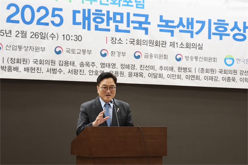 우원식 국회의장이 26일 오전 국회 의원회관에서 열린 ‘국회기후변화포럼 2025 대한민국 녹색기후상 시상식’에 참석했다. 이 시상식은 2010년에 설립된 국회기후변화포럼이 주최하며, 기후변화 대응과 탄소중립 사회 추진에 기여한 개인과 단체에게 수여하는 상이다. 포럼은 여야 공동대표 체제로 운영되고 있다.