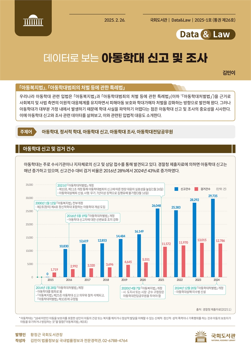 국회도서관(관장 황정근)은 2월 26일(수) ‘데이터로 보는 아동학대 신고 및 조사’를 주제로 『Data & Law』(2025-1호, 통권 제26호)를 발간했다고 밝혔다. 이 보고서는 아동학대 예방과 피해아동 보호를 위한 신고 및 조사 과정을 데이터와 법률적 관점에서 분석한 자료다.