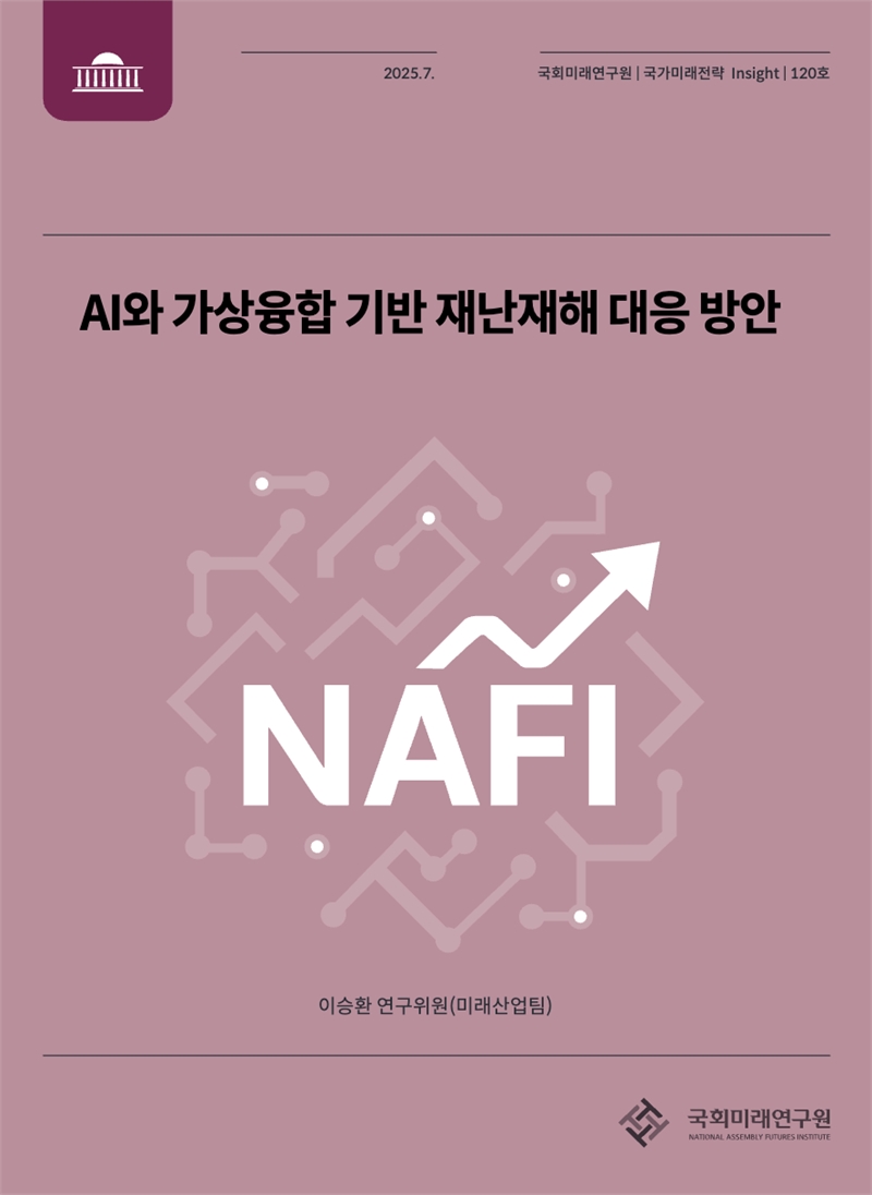 국회미래연구원(원장 김기식)은 7월 24일(목)에 『국가미래전략 Insight』“AI와 가상융합 기반 재난재해 대응방안”을 발간했다. 본 브리프는 재난이 일상화된 현시점에서, 왜 재난대응이 실패하는지 분석하고, 다양한 사례 분석을 통해 AI와 가상융합을 활용한 재난 대응체계 혁신 방안을 제시했다.