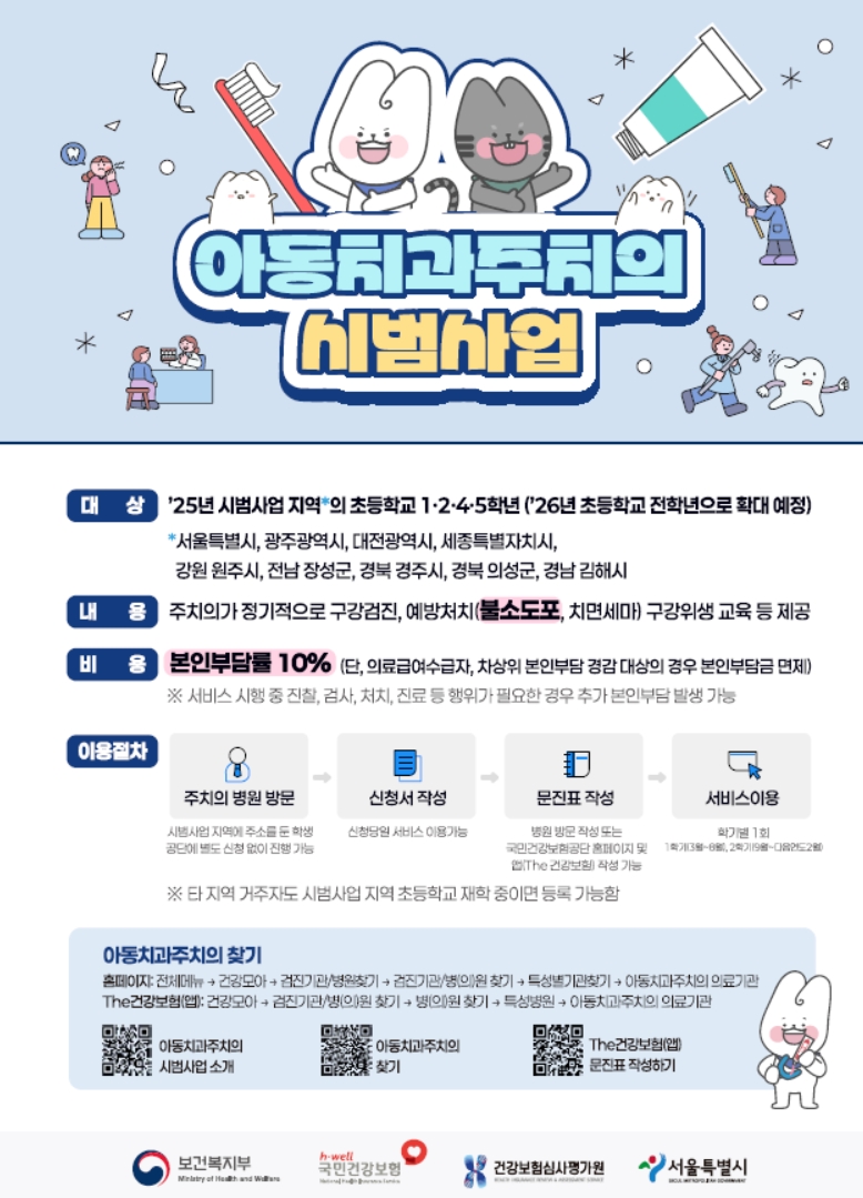'아동치과주치의 건강보험'은 2027년 2월까지 2024년 기준 1,4학년을 대상으로, 2025년에는 1,2,4,5학년 대상으로 확대 운영된다. 기본진료비 4,720원으로 학기당 1회씩 최대 6회(3년간)까지 이용할 수 있다. 1회 진료비는 47,210원이지만 이 중 90%는 건강보험이 지원하여 학생은 본인부담금 10%만 내면 된다. 또한, 차상위계층 및 의료급여대상자는 본인부담금이 감면 적용되어 무료로 이용 가능하다.