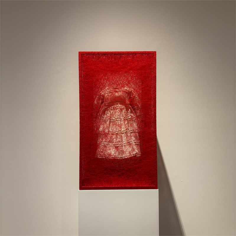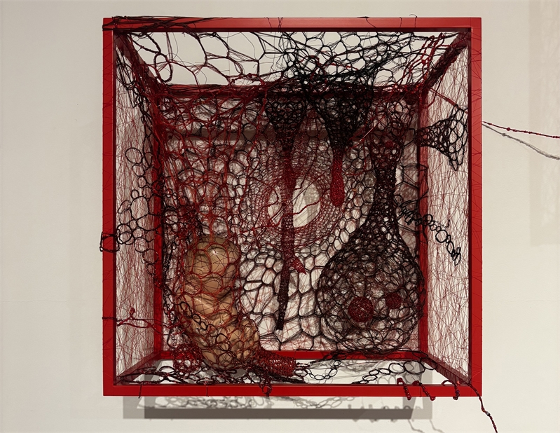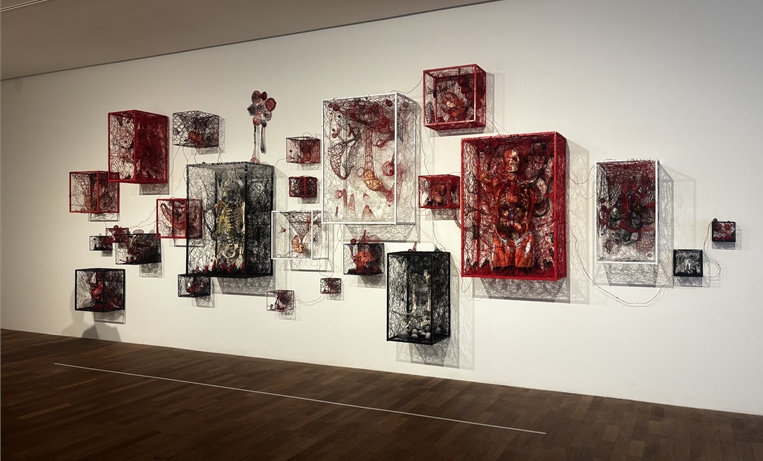 · 꾸이 : 저는 1층에서 마주한 빨간 실 작품이 제일 강렬하게 다가웠어요. 솔직히 섬뜩하기도 했어요. 인조 뼈나 장기 같은 걸 빨간 실로 엮어낸 걸 보고 나니까, 마치 제가 직접 피를 흘린 듯한 불편함이 밀려왔어요. 제 취향은 아니었지만, 어쩔 수 없이 제 경험이 겹쳐졌던 것 같아요. 예전에 디스크 수술을 했을 때의 감정이 떠올랐거든요. ‘왜 하필 나일까’라는 생각, 그때의 우울감이 다시 밀려와서… 작품이 훨씬 더 무겁게 다가왔습니다.