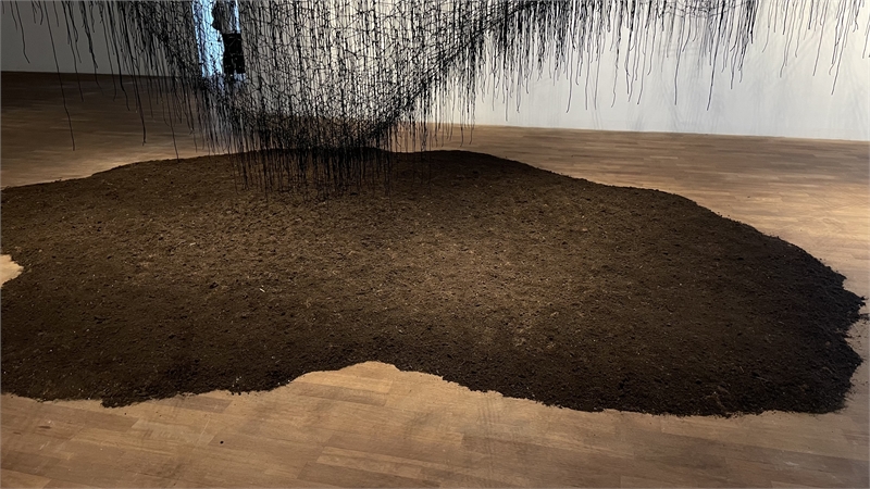· 밍구 : 근데 2층에 있던 대형 설치 작품은 정말 인상적이지 않았어요? 공간 전체를 실로 채우니까 훨씬 입체적으로 느껴졌어요. 실이 바닥의 흙과 이어져 있어서, 이게 뿌리인지 줄기인지 알 수 없는 모습이 좋았어요. 연결이라는 단어가 떠올랐달까요.